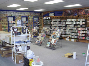 Now shortly before this time, we started to deal in used DVDs and Blu Ray discs. We also started to deal in 3rd party new video game accessories such as controllers and hookups as finding enough originals to keep on hand was getting difficult. Our inventory grew so fast with this. Video Games were bursting at the seems and we had to add shelves by the short "Magic" wall to display DVDs and more shelves in between the back issue tables for more of them. We had a CRT TV set up for customers to play test games before they bought them. Most customers did not take advantage of this. Our trade paperback (graphic novels) section had blown up in size and we had to put bookshelves in from of the windows to discourage break ins and to fit all of the books. It had gotten a tad dark in the store and we were filling it to the brim with inventory. We had set up a Clearance table in the front of the store for products that we had been sitting on for awhile. It was becoming obvious that we were running out of space. We had purchased some used glass display cases a few years earlier to replace the wood display cases you had seen in previous posts and those were full. The wire racks we added in front of the "Magic" wall was full. The racks we added in between the comic tables were full. The comic back issue tables were full on the top and the bottom. And our seating for Friday Night Magic was limited. We were clearly needing more space.